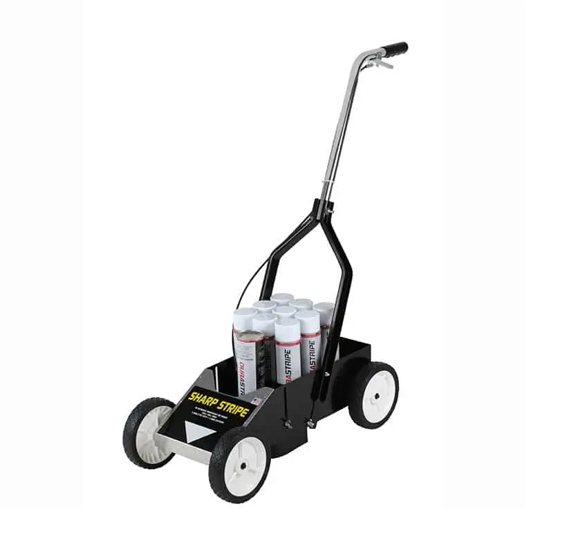 The perfect no-hassle system for striping athletic fields. Specially designed to work with unique aerosol paint cans, guaranteed not to clog. Specially formulated for sharp lines on grass or pavement. Paint will not harm grass or wash away in the rain.