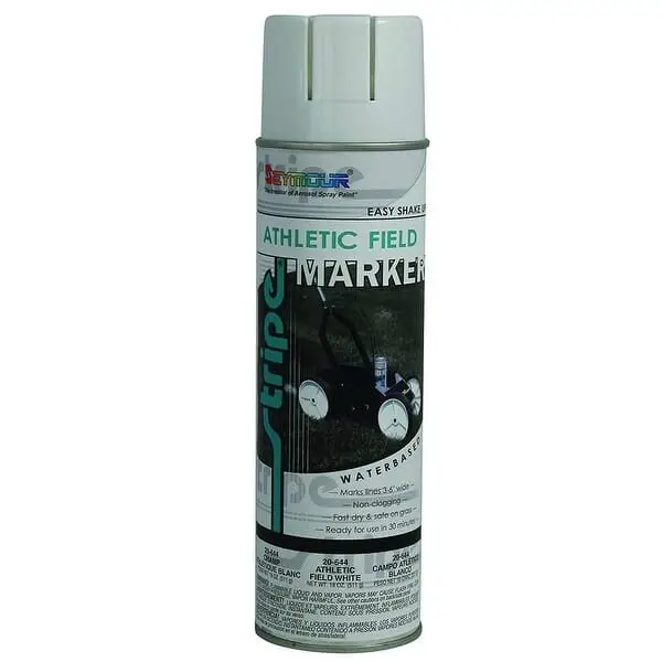 A long lasting athletic field paint that makes sharp, well defined stripes in one application. Dries in 15 minutes, is VOC compliant, and is safe for grass. One can will stripe approximately 300 linear feet (@ 4″ wide stripe). Makes stripes 3″-5″ wide. The universal spray head works in most marking machines.